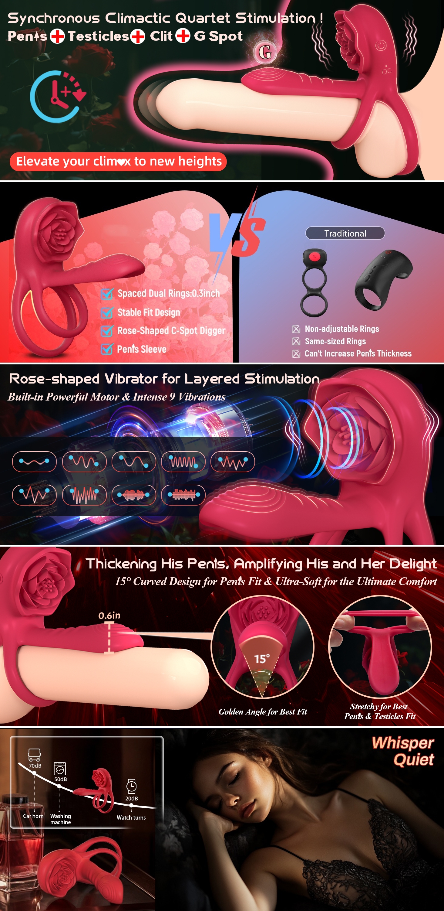 • Quadruple Stimulation: Dual rings for penis and testicle constriction, with stimulation for the c-spot and g-spot for complete pleasure.